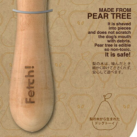 Fetch!は厳選された梨の木から作られたワンちゃん用のおもちゃです。梨の木は無害であり、他の樹木と比べ繊維密度が高く堅いので噛んだとき細かく砕けトゲなどが残りにくい特徴があります。