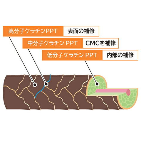 カシミヤ由来ケラチン、低刺激アミノ酸系ベース、リン脂質誘導体(CMC 類似成分)、マルチコラーゲン、吸着型ヒアルロン酸、緑茶エキス