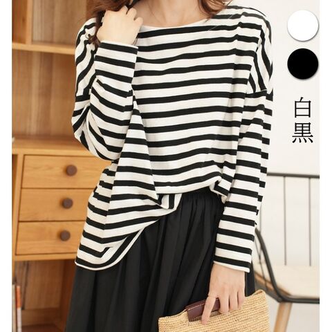 スイモク ボーダートップス Tシャツ レディース 長袖Tシャツ カジュアル ボーダー柄 ゆったり ロンT カットソー プルオーバー ロングtシャツ ルームウエア ゆったり オールシーズン オシャレ 無地 女性用 肌着 重ね着 綿 5682205【水沐良品】
