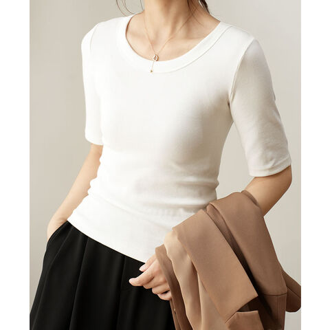 スイモク 5分袖 カットソー Tシャツ レディース トップス リブ デイリー 五分袖 半袖 肌触りの良い素材 大きいサイズ きれいめ 夏 ナチュラル おしゃれ 透けにくい 透けない オフィス スーツ シンプル カーキ 5683037【水沐良品】