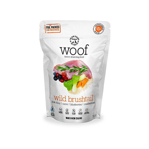食物アレルギーを発症しにくいブラッシュテイルを主原料に、各種効果を期待できるマヌカハニー、チアシード、バージンココナッツオイル、ホキ肝油、緑イ貝、ケルプを配合しています。素材の「生」を大切に!安心のフリーズドライ製法で作っています。3倍量の水または37度以下のぬるま湯でふやかして与えるとおいしさ満点。フリーズドライドッグフードなので、お湯で戻すとまるで手作りフードように子犬からシニア期のワンちゃんまで与えやすい食事を作ることが出来ます。特に食物アレルギーが心配な犬におすすめします。