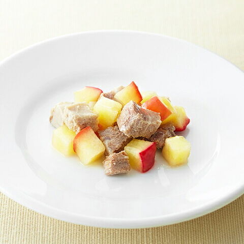 豚肉とリンゴが入ったフードです。豚肉には疲労を回復し、皮膚や粘膜を守る働きがあるといわれています。また、リンゴは腸内の善玉菌を増やす効果があるので、お腹の弱いワンちゃんにおすすめです。いつものドライフードにトッピングしたり、寒い時期は、スープを温めてあげると体を温める効果もあり、香りも立つのでワンちゃんも喜んでくれます。動物たちの健康をサポートし、地域への貢献を目指して運営している獣医師団体「葉月会」が推奨しています。