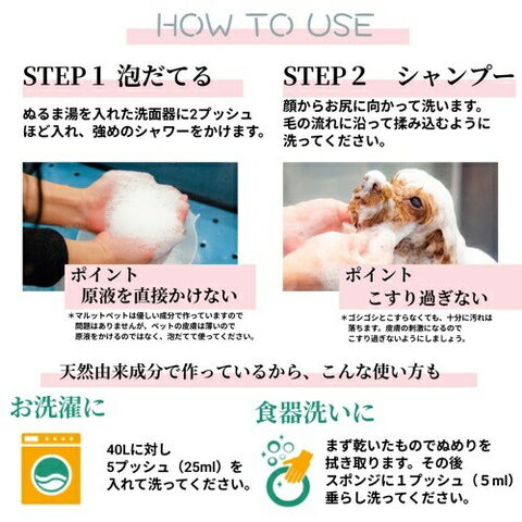 ・嗅覚の鋭いペットのことを考えてあえて香らないシャンプーです。・強い香りが苦手な飼い主さんにもオススメです。・シンプル成分で作っているため、泡切れ良し、乾きも早い。シャンプー時間を短縮してトリマーさんと犬猫のストレス軽減にもなり、作業効率も上がり生産性も上がります。・コンディション成分配合でリンスなしでも仕上がります。・SDS安全シートを取得し、JIS規格の成分。人用の化粧品と同じ企画で作っているから、トリマーさんの手も荒れません。・厳選した天然由来成分のみで作っています。・安心の全成分表示です。