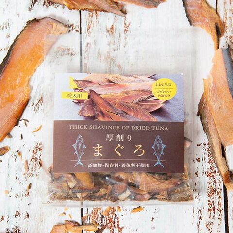 国産まぐろにこだわり、一枚一枚厚削りした添加物・保存料・着色料不使用の厚削りまぐろをご堪能下さい。食感を残す為にあえて厚めに削り、コク、旨味や風味豊かな味わいをお楽しみ頂けます。