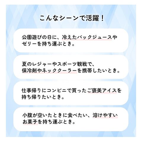 冷蔵庫で冷やしたパックジュースやアイスを手軽に持ち運べる便利な保冷ポーチです。