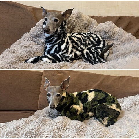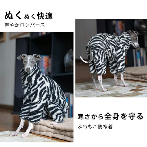 犬服 ロンパース 犬用ロンパース イタグレ服 ウィペット服 小型犬 中型犬 冬用 防寒 保温 軽量 あったか ふわもこ おしゃれ 部屋着 散歩用 ペットウェア ゼブラ柄 アニマル柄 イタリアングレーハウンド イタグレ ミニピン ミニチュアピンシャー ウィペット ペット服 いぬ