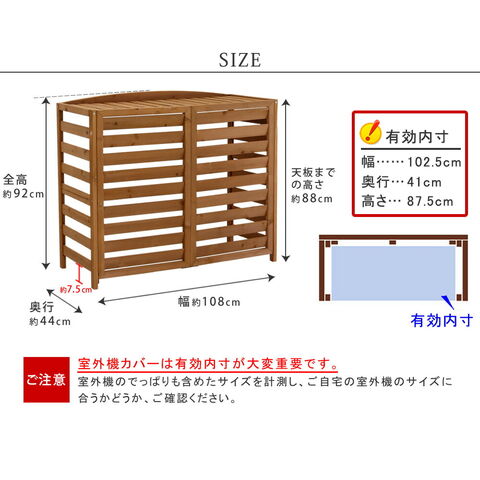 | ■ご注意 | 室外機カバーは有効内寸が大変重要です。 室外機のでっぱりも含めたサイズを計測し、ご自宅の室外機のサイズに合うかどうか、ご確認ください。 |
