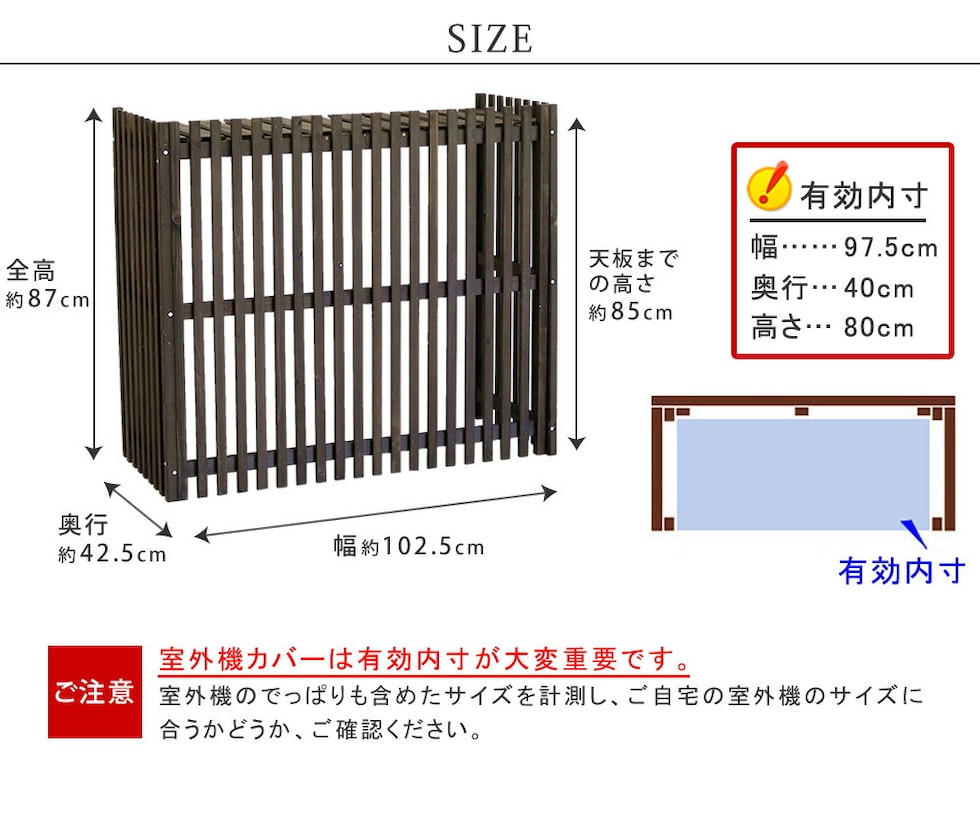 | ■ご注意 | 室外機カバーは有効内寸が大変重要です。 室外機のでっぱりも含めたサイズを計測し、ご自宅の室外機のサイズに合うかどうか、ご確認ください。 |
