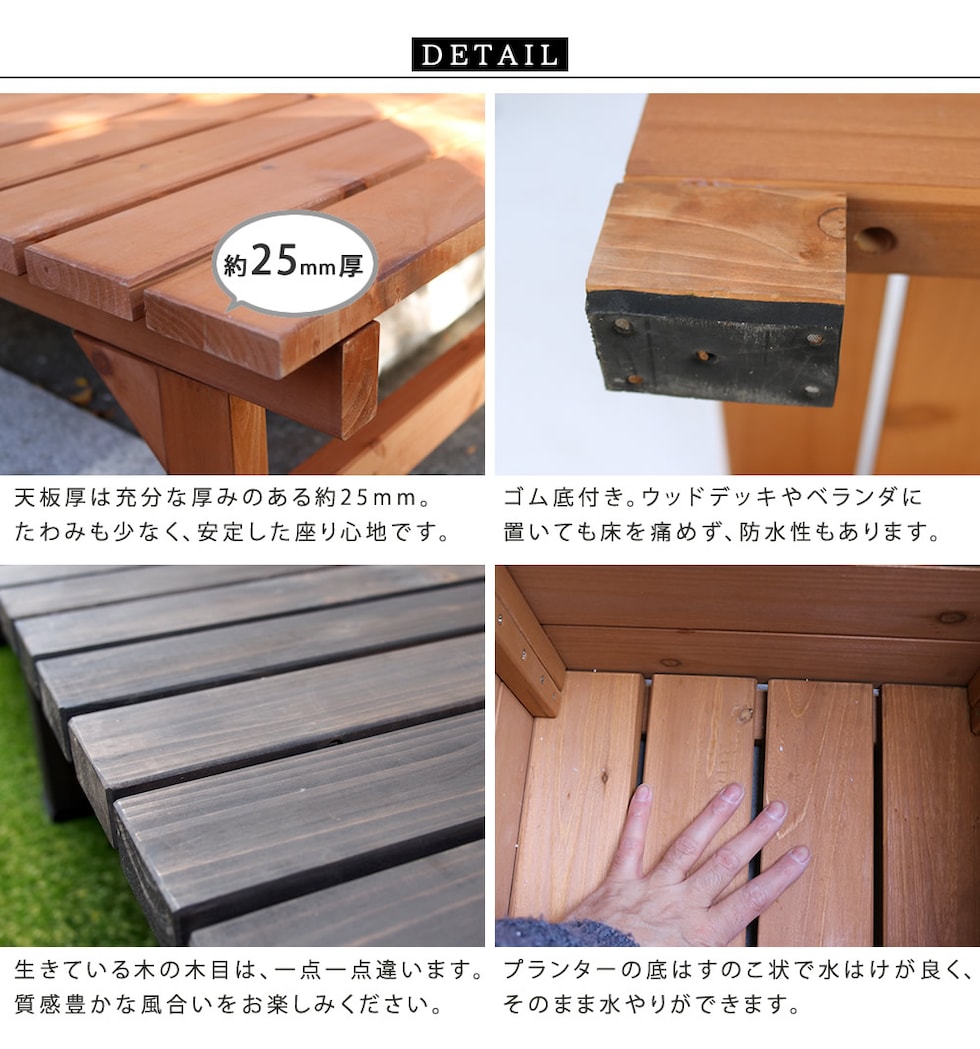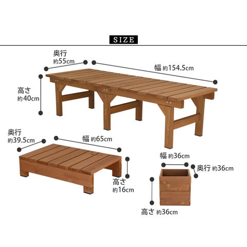 | ■サイズ(約) | デッキ縁台:幅 1545×奥行 550×高さ 400mm ステップ:幅 650×奥行 395×高さ 160mm プランター:幅 360×奥行 360×高さ 360mm |