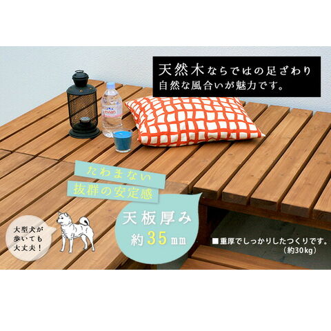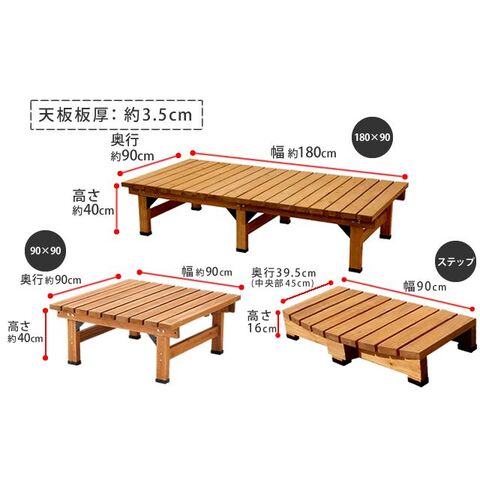 | ■サイズ | デッキ縁台(幅180):幅 約1800×奥行 約900×高さ 約400mm デッキ縁台(幅90):幅 約900×奥行 約900×高さ 約400mm ステップ:幅 約900×奥行 約395(中央部 約450)×高さ 約160mm |