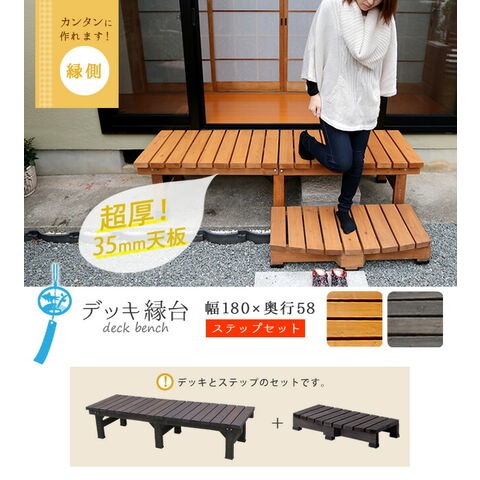 住まいスタイル デッキ縁台 180×58 ステップセット【送料無料 ウッドデッキ風 簡単 縁側 本格的 DIY 木製 天然木 庭 ベランダ マンション おしゃれ 小型 北欧 ガーデン 屋外 家具 ライトブラウン ダークブラウン】