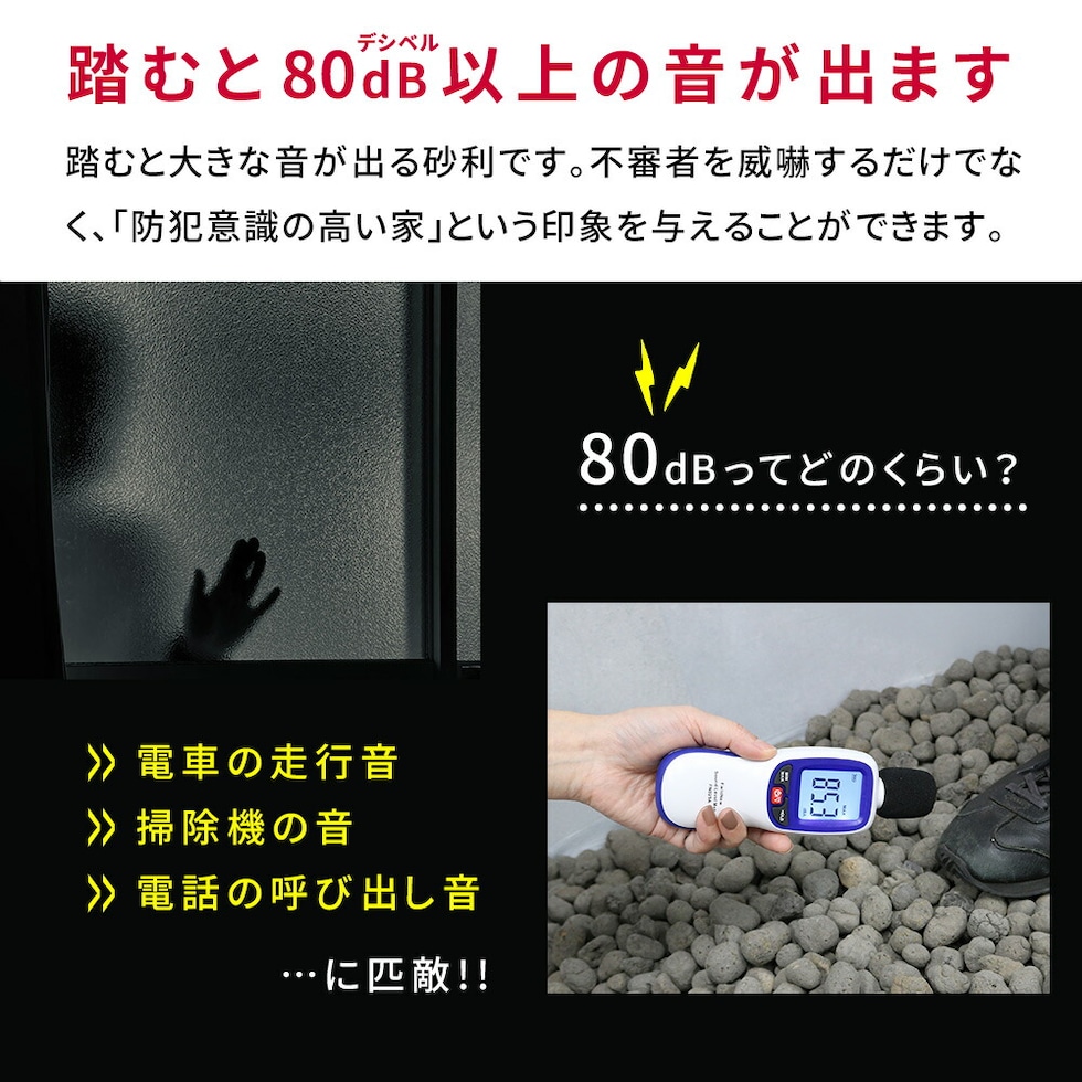 踏むと大きな音が出る砂利です。不審者を威嚇するだけでなく、「防犯意識の高い家」という印象を与えることができます。