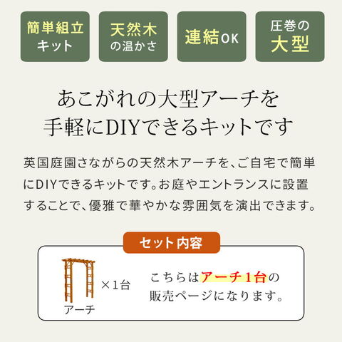 英国庭園さながらの天然木アーチを、ご自宅で簡単にDIYできるキットです。