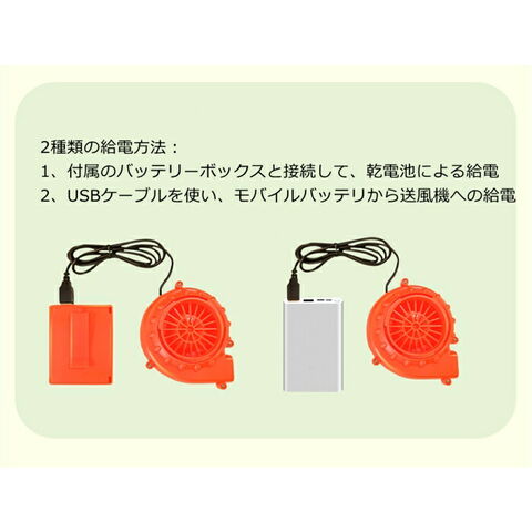 2、USBケーブルを使い、モバイルバッテリから送風機への給電 。