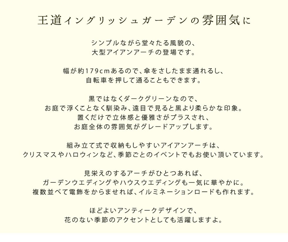 組み立て式で収納もしやすいアイアンアーチは、クリスマスやハロウィンなど、季節ごとのイベントでもお使い頂いています。