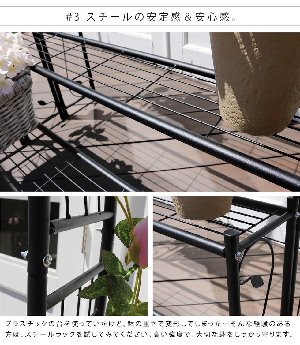 見慣れたプランターやオブジェも、ラックに並べるとスッキリおしゃれな印象に。