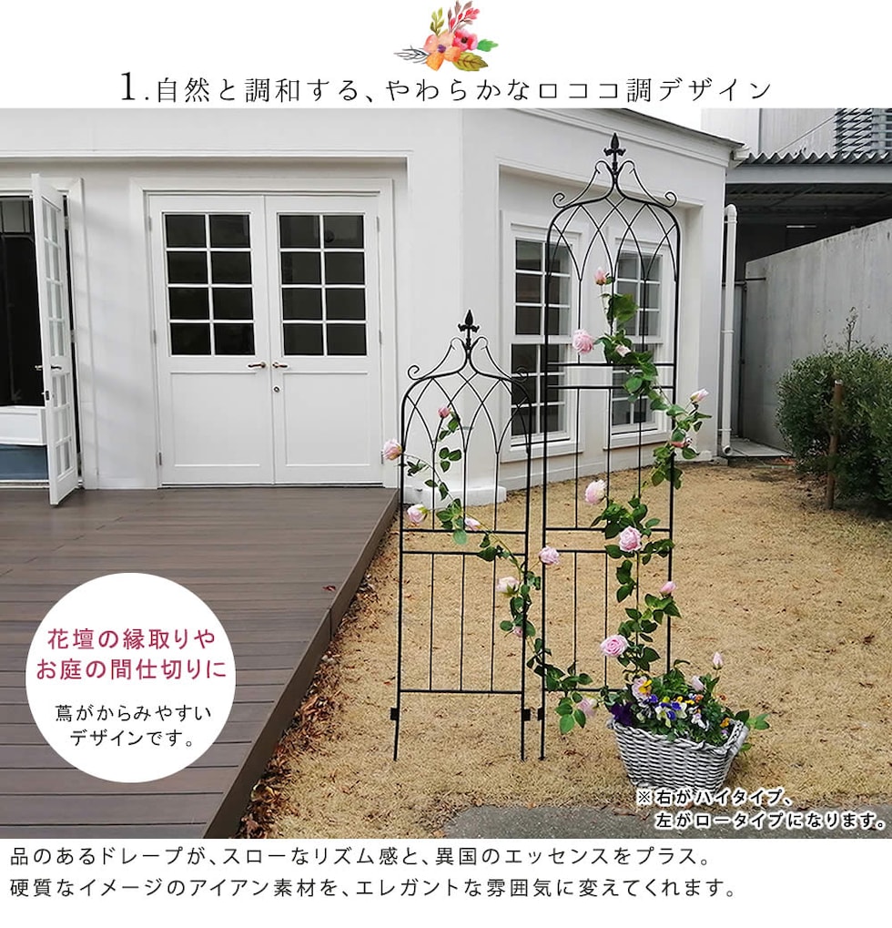 アイアンは丈夫で耐久性があり、薔薇やクレマチス、アイビーなどの誘引がしやすいだけでなく、装飾品のように美しいので、お庭にあるだけで素敵ですね。