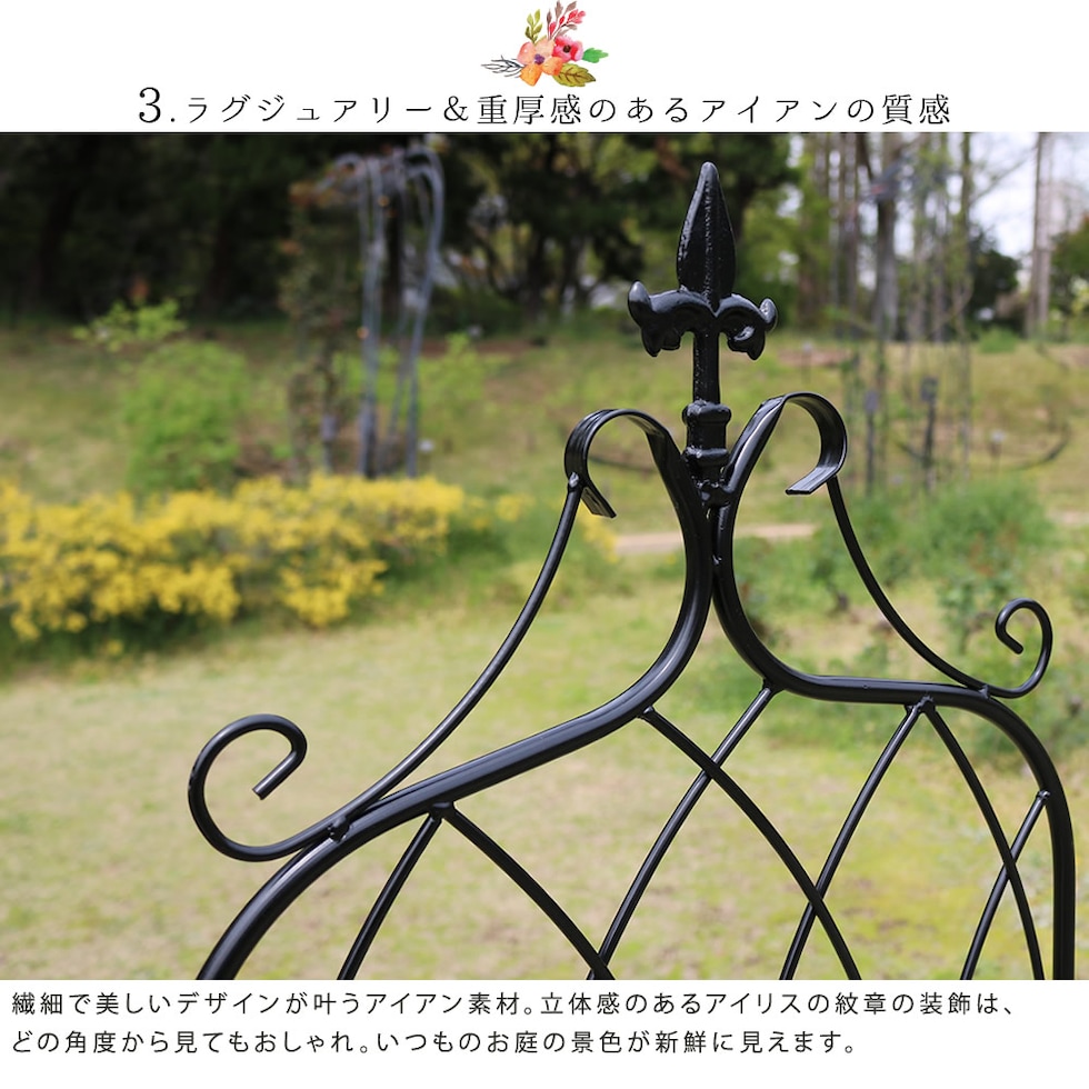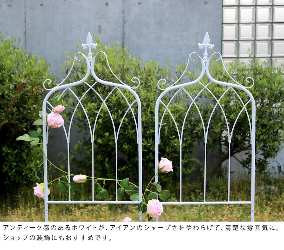 アイアンは丈夫で耐久性があり、薔薇やクレマチス、アイビーなどの誘引がしやすいだけでなく、装飾品のように美しいので、お庭にあるだけで素敵ですね。