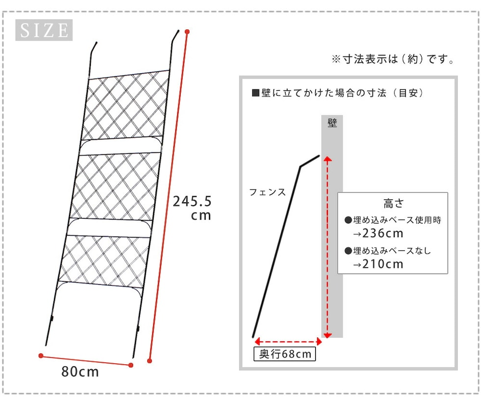 | ■■ご注意 | ・必ずご使用になりたい場所のサイズを測ってからご購入ください。 ・立てかけるだけの場合、強風により転倒の恐れがございます。お客様自身で固定いただきますようお願いいたします。 ・アパート・マンションの規約により、背の高い設置物が認められていない場合があります。ご確認の上、ご購入をお願いいたします。 |