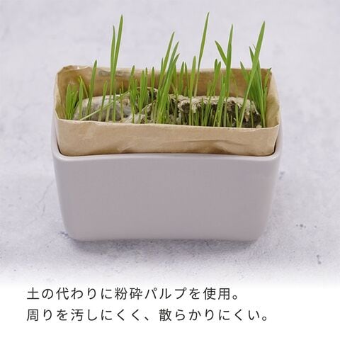 土の代わりに再生粉砕パルプを使用した猫草栽培キット。種まき不要で袋を開けて水を注ぐだけなので手軽に栽培することができます。