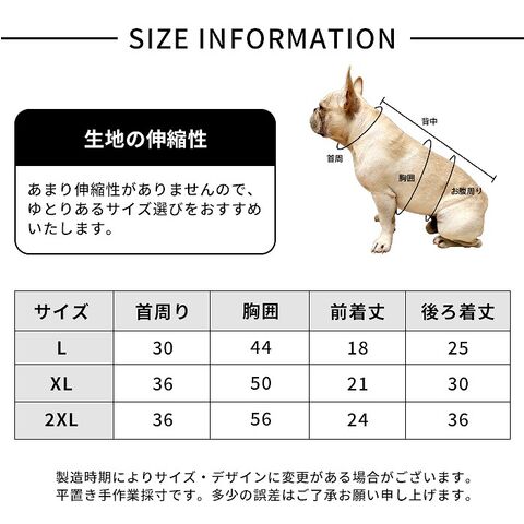 XL:首回り36cm 胸囲50cm 前丈21cm 後ろ丈30cm