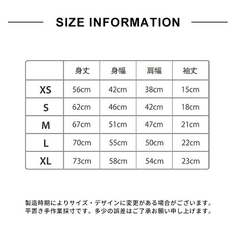XS:身丈56 身幅42 肩幅38 袖丈15cm 推奨身長:148?158cm
