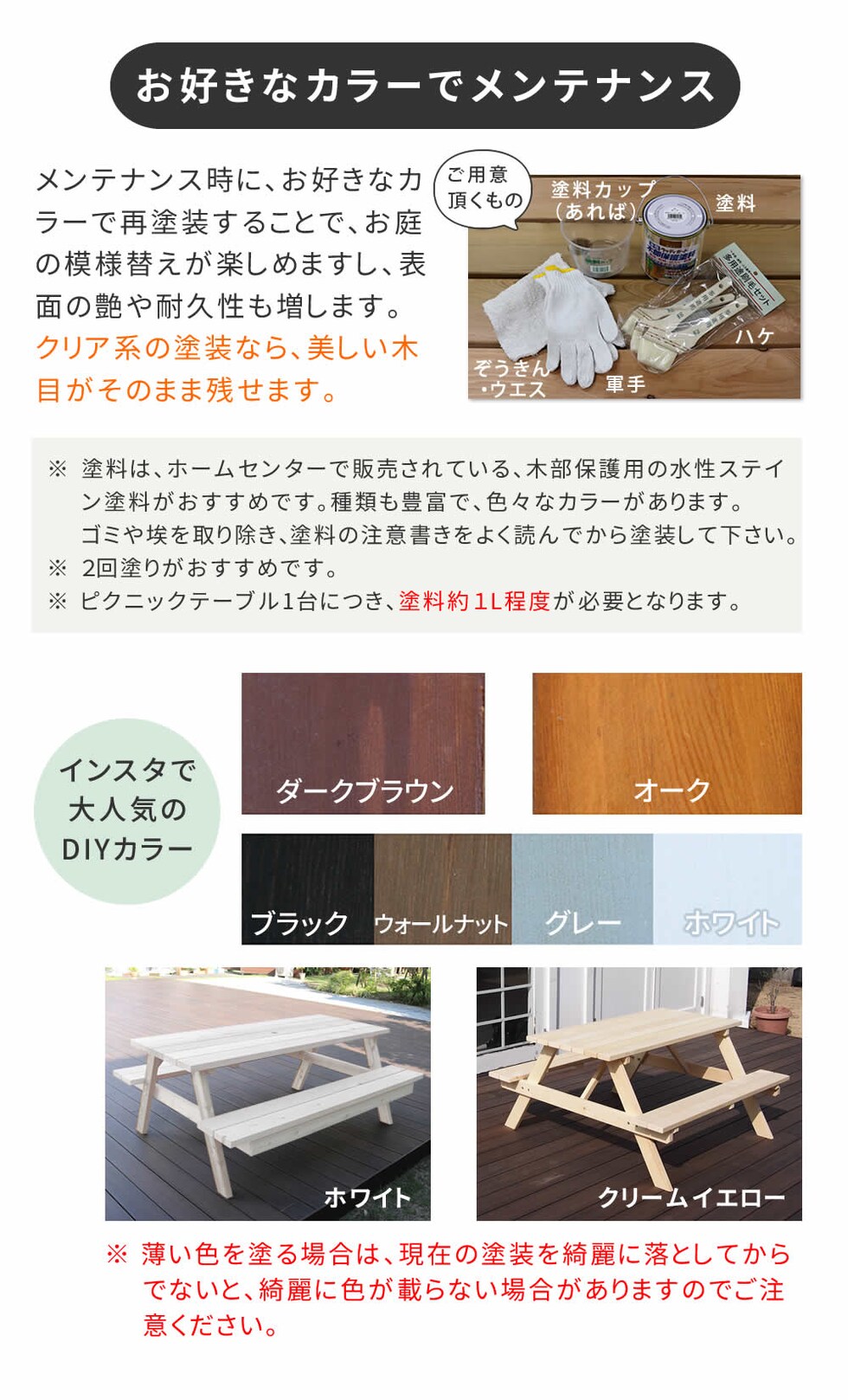 ※こちらは国産のひのき材に、防腐・防蟻(ACQ)加工を施した上、木材保護塗料の「ウォールナットブラウン」を、丁寧に2度塗りしたピクニックテーブルになります。