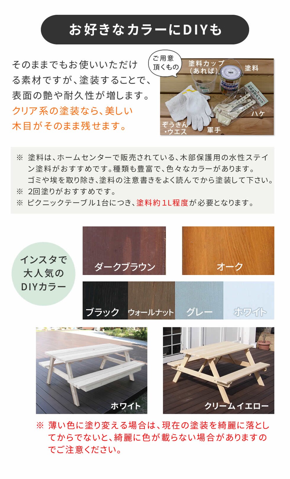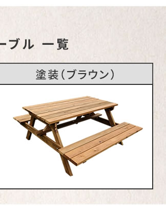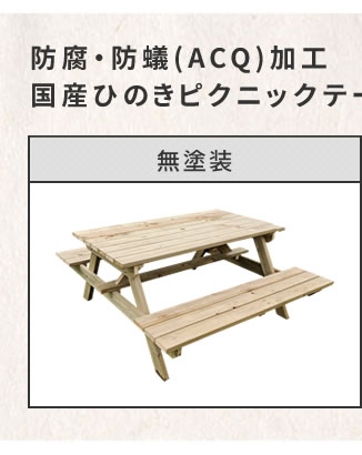 ※こちらは国産のひのき材に、防腐・防蟻(ACQ)加工を施したピクニックテーブルになります。塗装は施しておりません。