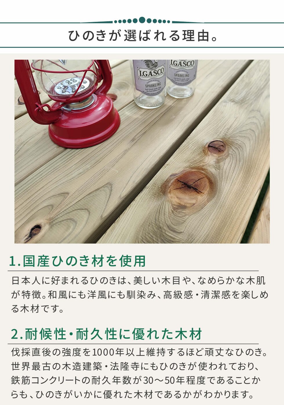 高品質な国産ひのき材をたっぷりと使用し、国内工場生産で安心安全。防腐・防蟻(ACQ)加工で耐久性も抜群です。