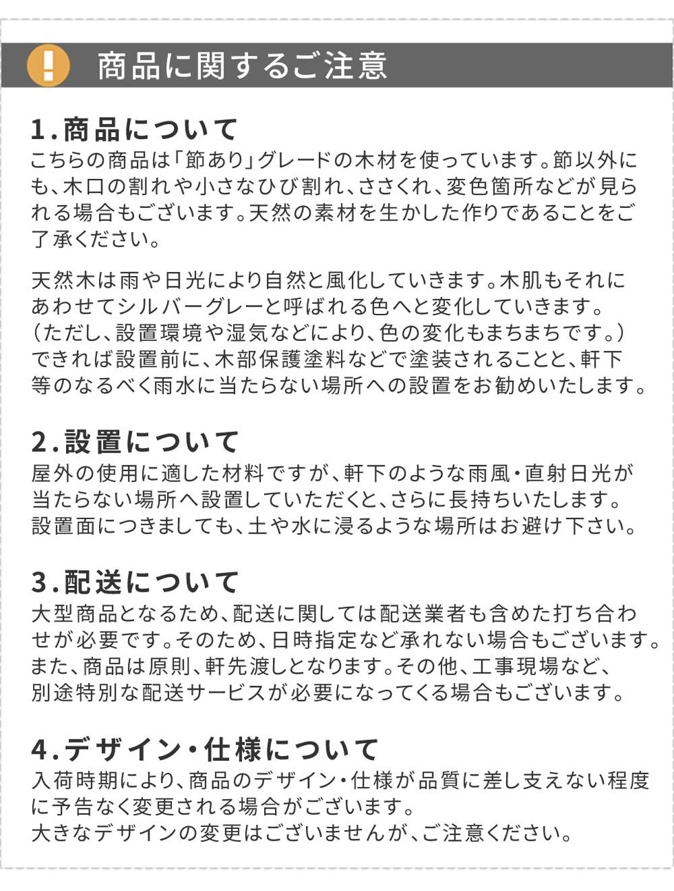 | ■備考 | ※こちらの商品は「節あり」グレードの木材を使っています。節以外にも、木口の割れや小さなひび割れ、ささくれ、変色箇所などが見られる場合もございます。天然の素材を生かした作りであることをご了承ください。 ※天然木は雨や日光により自然と風化していきます。木肌もそれにあわせてシルバーグレーと呼ばれる色へと変化していきます。(ただし、設置環境や湿気などにより、色の変化もまちまちです。) できれば設置前に、木部保護塗料などで塗装されることと、軒下等のなるべく雨水に当たらない場所への設置をお勧めいたします。 ※屋外の使用に適した材料ですが、軒下のような雨風・直射日光が当たらない場所へ設置していただくと、さらに長持ちいたします。設置面につきましても、土や水に浸るような場所はお避け下さい。 ※大型商品となるため、配送に関しては配送業者も含めた打ち合わせが必要です。そのため、日時指定など承れない場合もございます。また、商品は原則、軒先渡しとなります。その他、工事現場など、別途特別な配送サービスが必要になってくる場合もございます。 ※入荷時期により、商品のデザイン・仕様が品質に差し支えない程度に予告なく変更される場合がございます。 大きなデザインの変更はございませんが、ご注意ください。 |