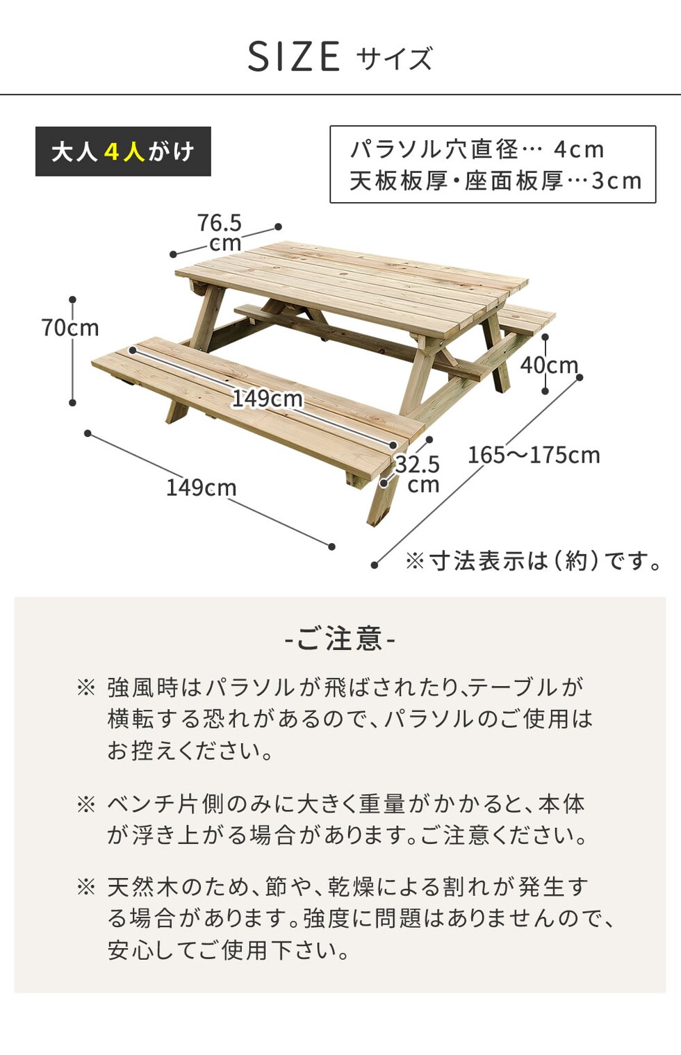 | ■サイズ | 本体:幅約1490×奥行約1100%~1745×高さ約700mm 天板サイズ:幅 約1490×奥行 約765mm パラソル穴:直径 約40mm 座面高さ:約400mm 座面サイズ:幅 約1490×奥行 約325mm |