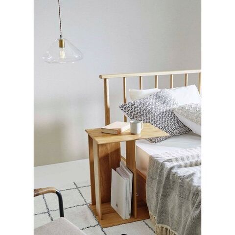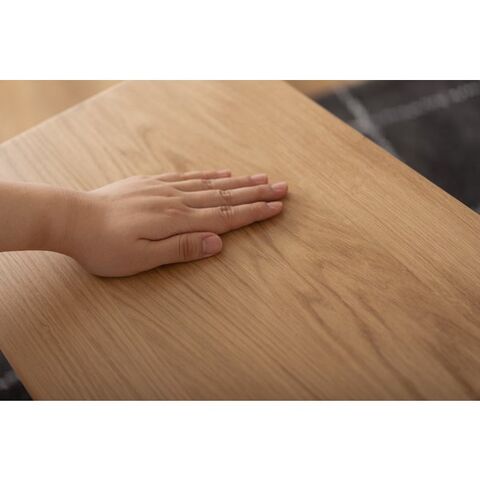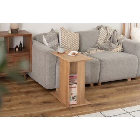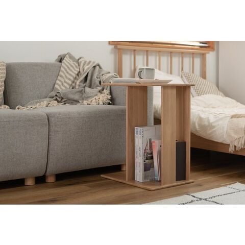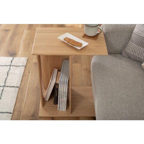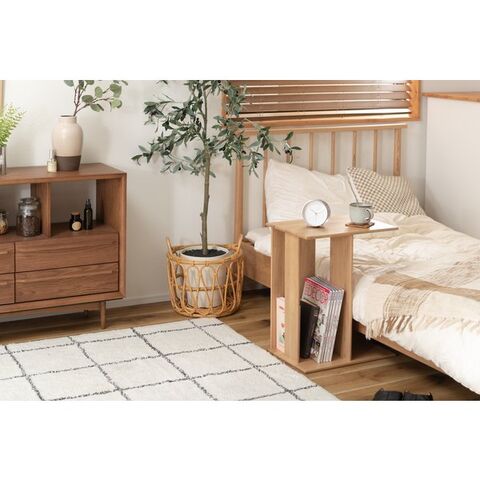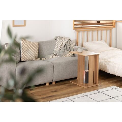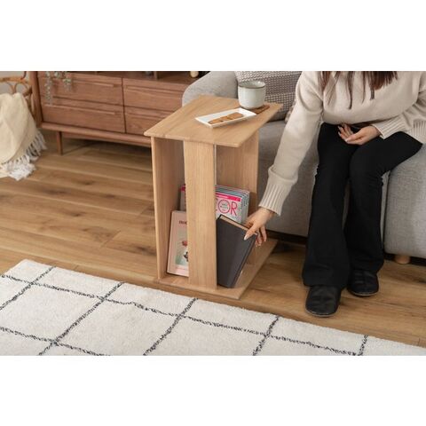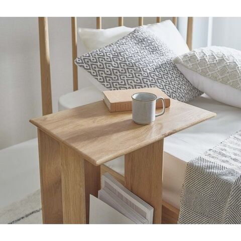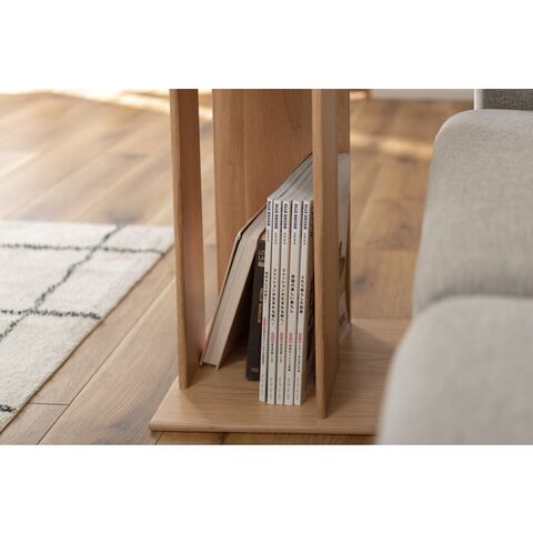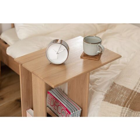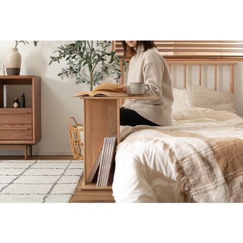 オークの無垢材を使用した美しい木目が特徴のサイドテーブル。足元の収納スペースが移動の手間を省き、空間を快適に。