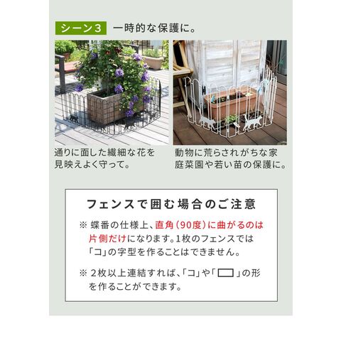 ※蝶番の仕様上、直角(90度)に曲がるのは片側だけになります。1枚のフェンスでは「コ」の字型にはできません。