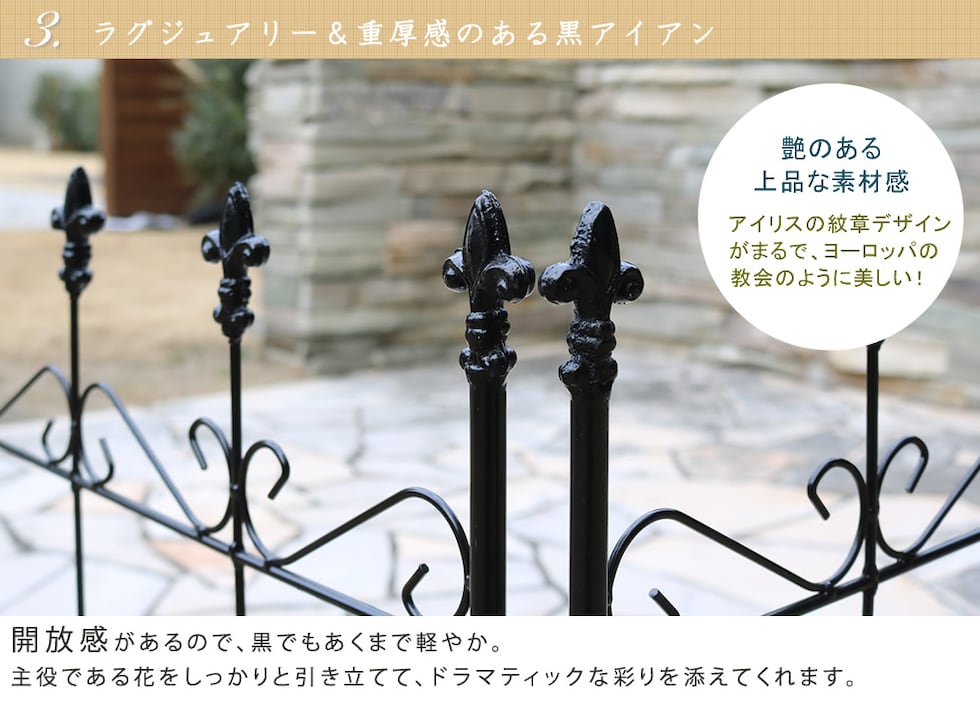 深い森の中に建つ石造りの古城…そんな雰囲気をただよわせる、繊細で風雅なデザインのアイアンフェンスです。