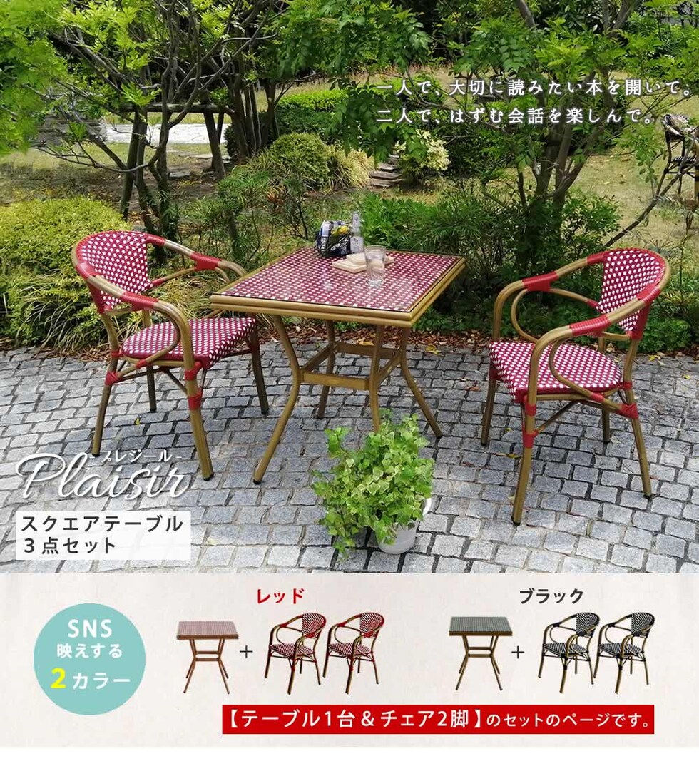 住まいスタイル スクエアテーブル3点セット「プレジール」<br>【送料無料 簡単組立 ガーデンテーブル PEラタン テラス 庭 レッド ブラック アルミ モダン スクエア イングリッシュガーデン ファニチャー シンプル 欧州 インテリア 家具 チェア カフェ】