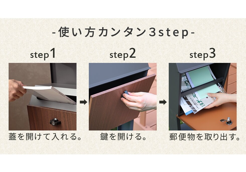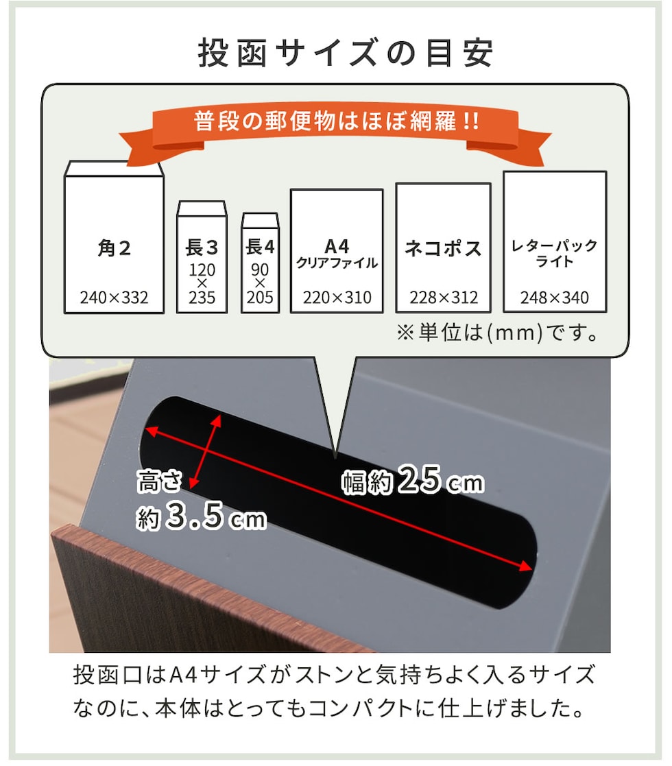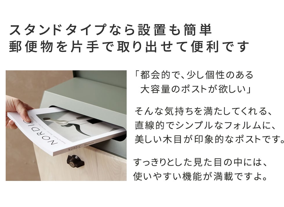 ●スタンドタイプなら設置も簡単。郵便物を片手で取り出せて便利です。