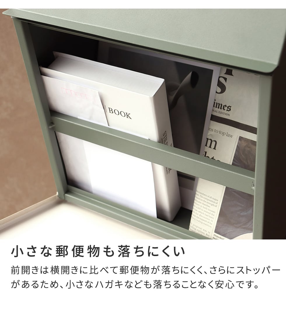 前開きは横開きに比べて郵便物が落ちにくく、さらにストッパーがあるため、小さなハガキなども落ちることなく安心です。