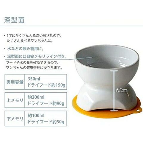 高さがある食器なので、ワンちゃんがラクな姿勢でお食事できます。浅型面と深型面があるので、食べる量や用途に合わせて使い分けできます。深型面には目安メモリライン付き。フードや水の量を確認することができるので、ワンちゃんの健康管理に役立ちます。