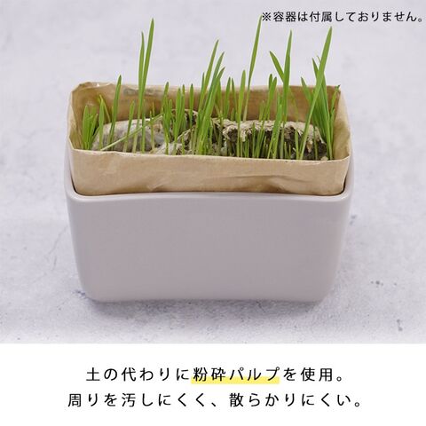 土の代わりに再生粉砕パルプを使用した猫草栽培キット。