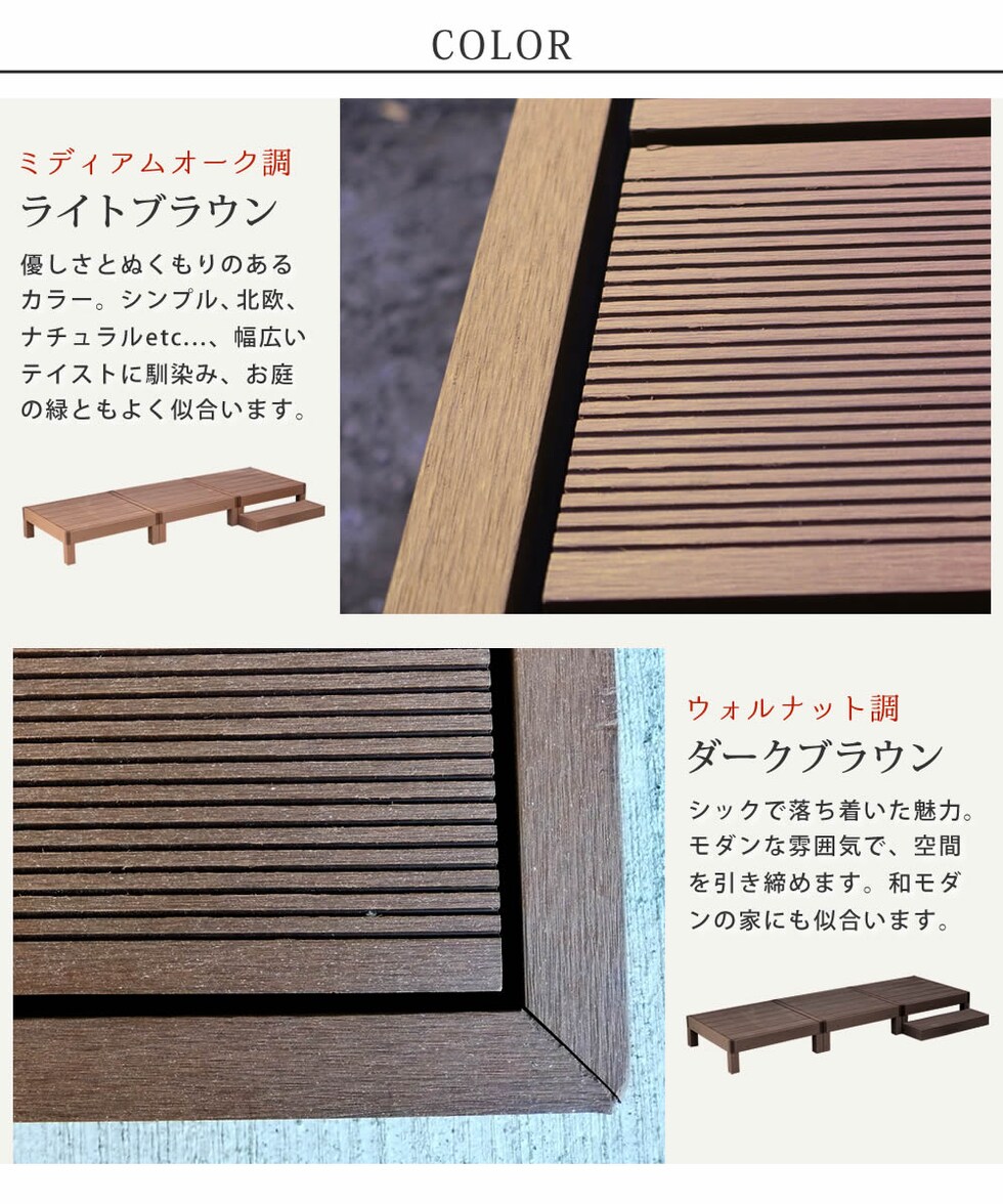 ウッドデッキ6台 ウッドデッキ6台+ステップ1台 ウッドデッキ6台+ステップ1台 +フェンス(ストレート・コーナー各1枚) |