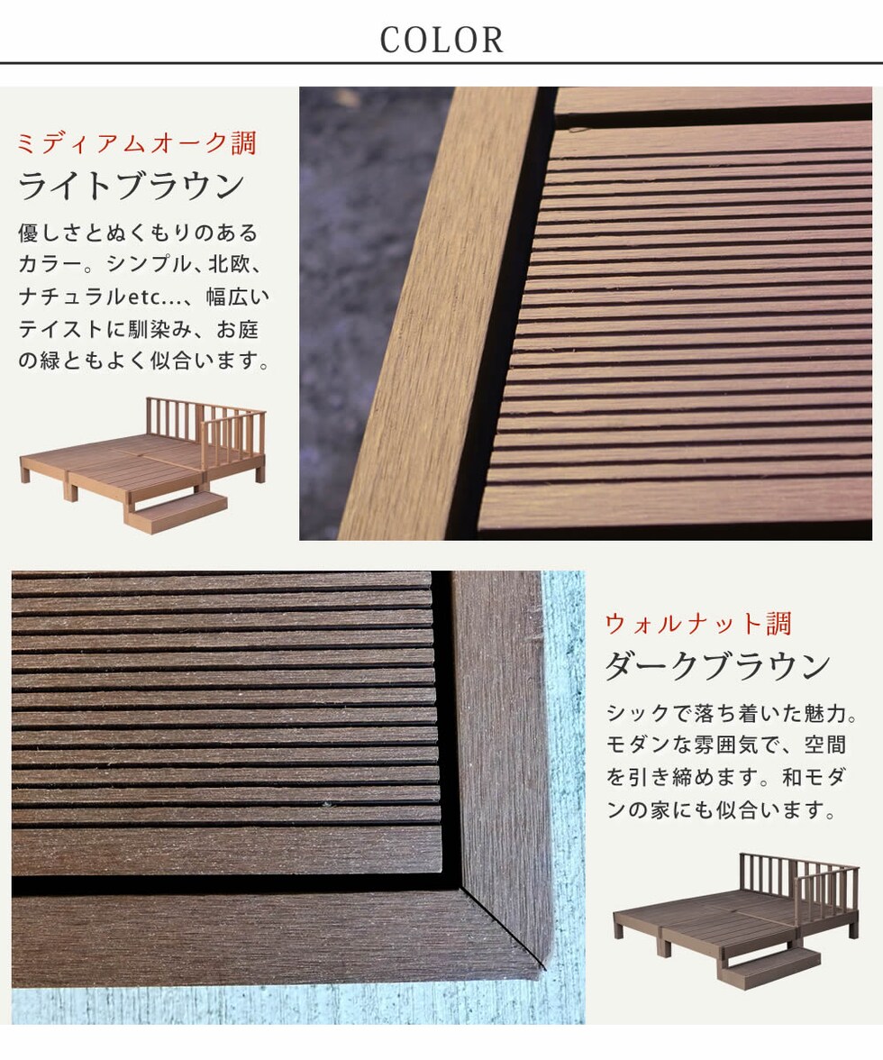 ウッドデッキ6台 ウッドデッキ6台+ステップ1台 ウッドデッキ6台+ステップ1台 +フェンス(ストレート・コーナー各1枚) |