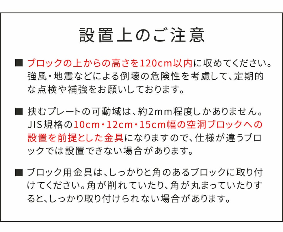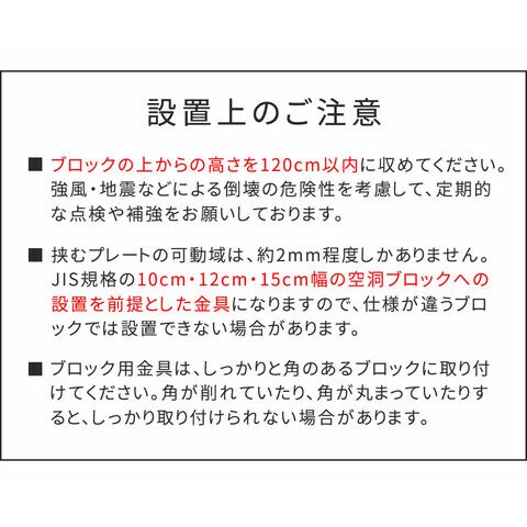 ※JIS規格の【10cm・12cm・15cm幅】の空洞ブロックへの設置を前提とした金具になります。ブロックの幅をよくご確認ください。