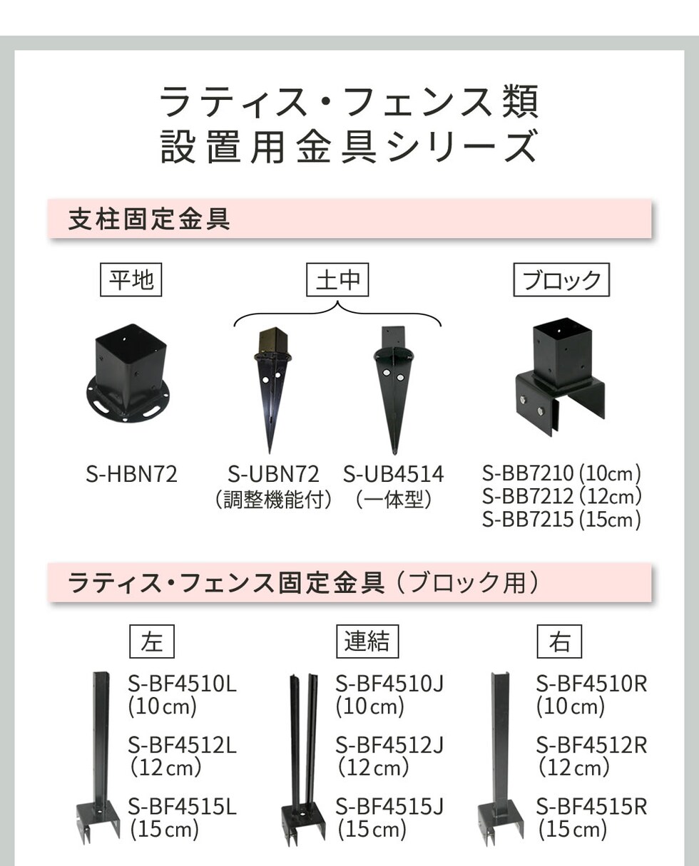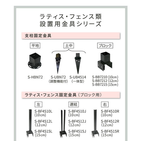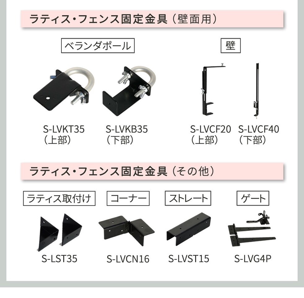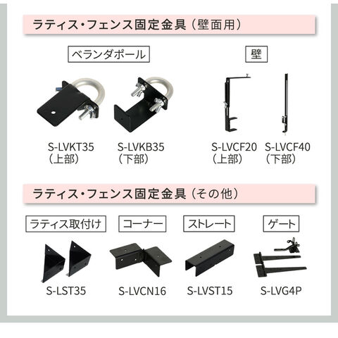 ※お庭やベランダ、店舗、公園等に、ラティスやフェンスを自作できる金具シリーズです。空間を仕切るだけでなく、日よけや、ディスプレイのベースとしても活用でき、DIY初心者さんでも簡単設置が可能。まるで作り付けのようなフェンスが設置でき、見映えのするエクステリアに。自宅に癒しの空間を。