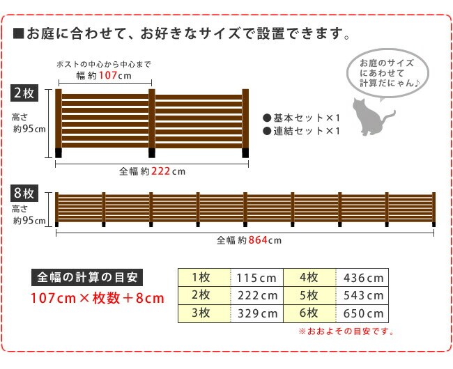 | ■サイズ | フェンス:幅 約1070×奥行 約27 高さ 約780mm ポール:幅 約74×奥行 約74×高さ 約950mm 土中用金具:幅 約140×奥行 約140×高さ 約460mm |