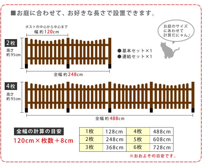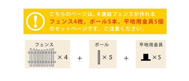 | ■商品名 | ピケットフェンスU型 4連結セット(平地用) ・フェンス…4枚 ・ポール…5本 ・平地用金具…5個 |