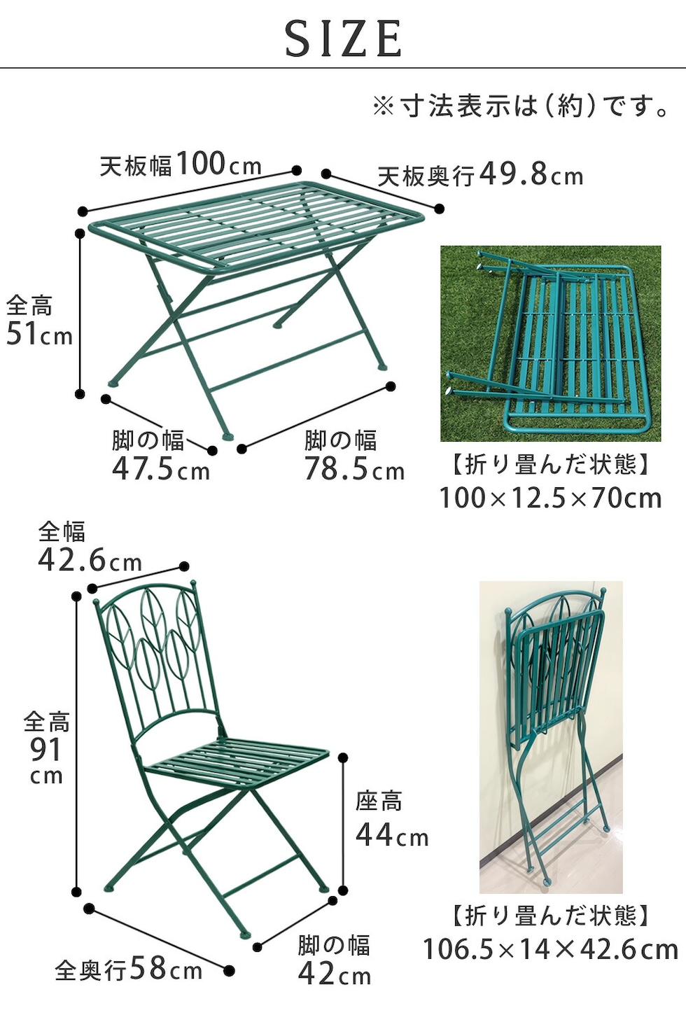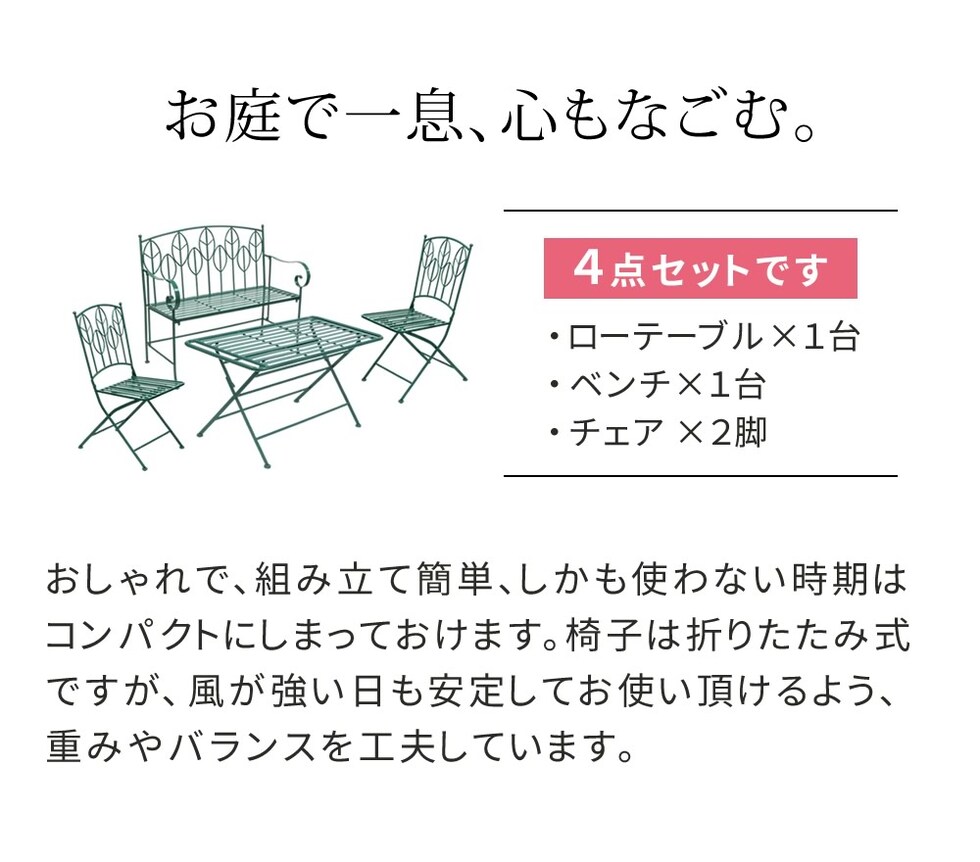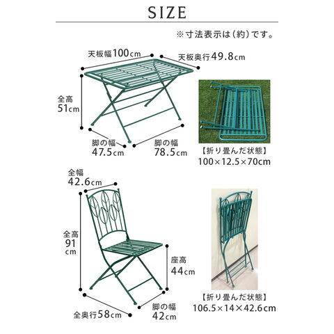 | ■サイズ(約) | ●ローテーブル:幅 1000×奥行 498×高さ 510mm →ローテーブル折り畳み時:幅 1000×奥行 125×高さ 700mm ●チェア:幅 426×奥行 580×高さ 910mm、座面高さ 440mm(1脚) →チェア折り畳み時:幅 426×奥行 140×高さ 1065mm(1脚) ●ベンチ:幅 1055×奥行 545×高さ 920mm /座面高さ443mm |