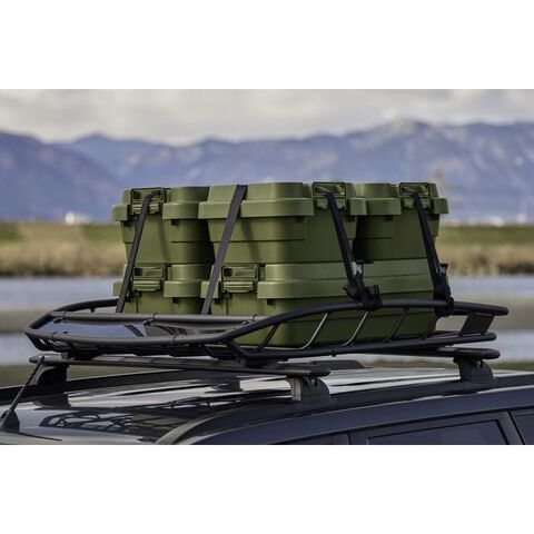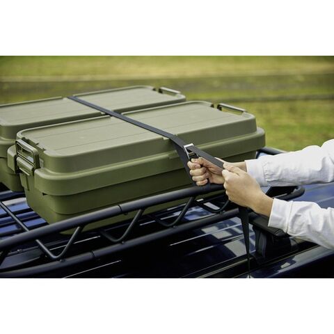 トランクカーゴに新サイズが登場。収納しやすく取り出しやすい浅型タイプでさらに容器内で荷物を整理できる仕切板(別販売)を使ってより便利になっております。トレー型でフラット形状のフタがテーブルとしても使え、積み重ねたときのズレも防止できる仕様となっております。また、フタにベルトガイドの溝を付けたことにより車のルーフキャリーなどに装着し固定できるようになっております。