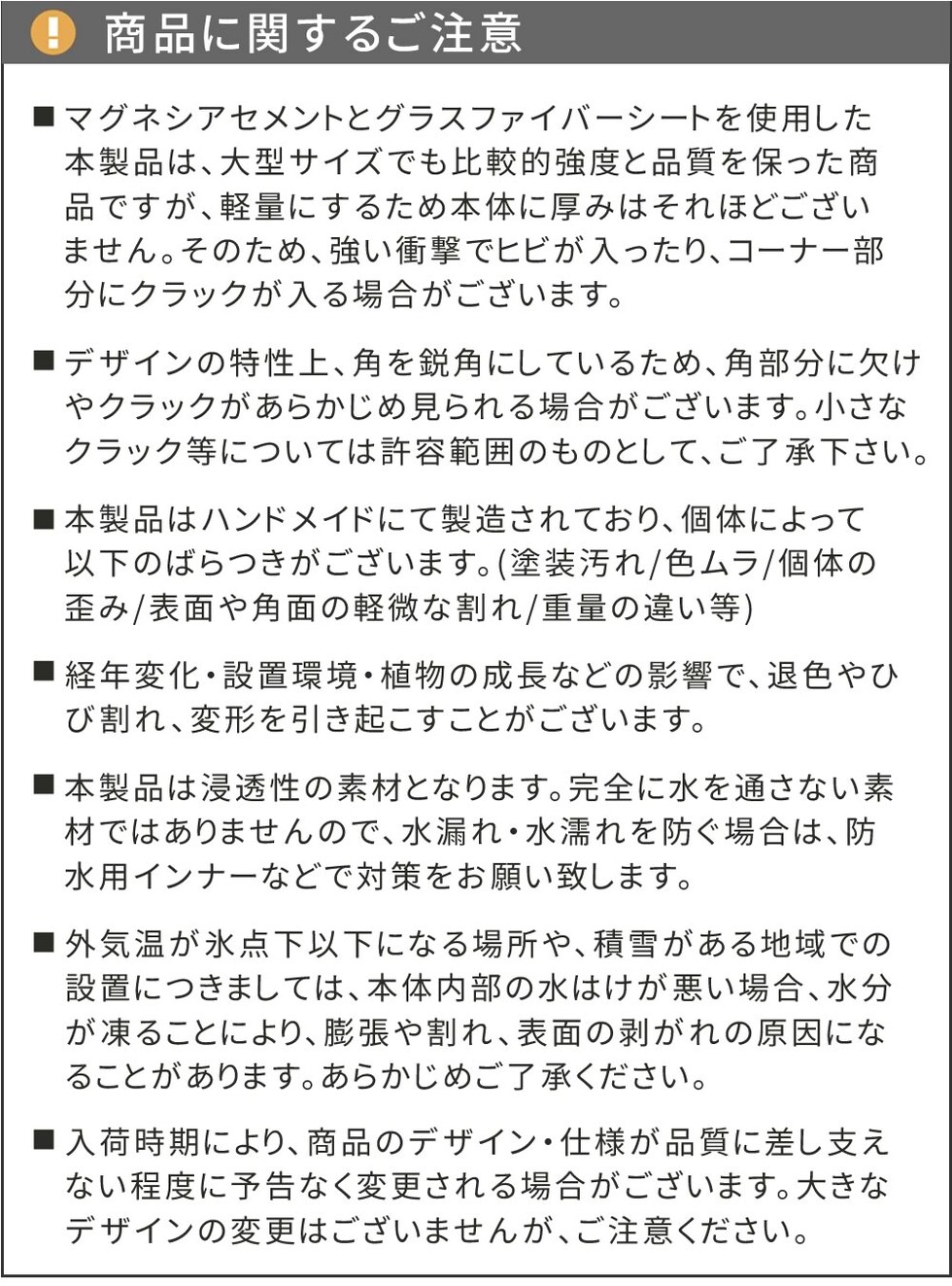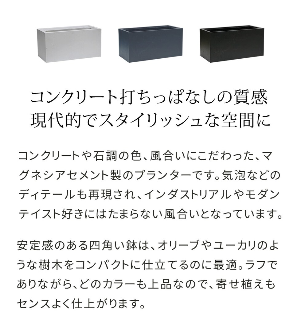 コンクリートや石調の色、風合いにこだわった、マグネシアセメント製のプランターです。