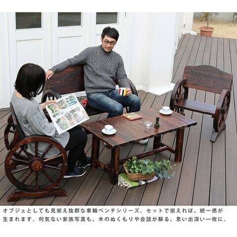 住まいスタイル 車輪ベンチ&焼杉テーブル3点セット(ベンチ小2台+テーブル)<br>【送料無料 簡単組立 天然木 木製 ガーデンテーブル 丸太 車輪ベンチシリーズ 庭 公園 什器 車輪 ログ カントリー 焼杉 古木調 テーブル チェア ベンチ 縁台 和風 モダン】