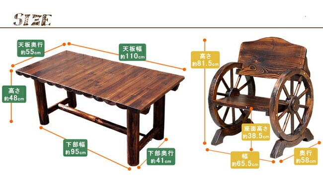 | ■サイズ | 【車輪ベンチ小】 本体:幅 約655×奥行 約580×高さ 約815mm 座面高さ:約385mm 【焼杉テーブル】 本体:幅 約1100×奥行 約550×高さ 約480mm 座面高さ:約480mm |